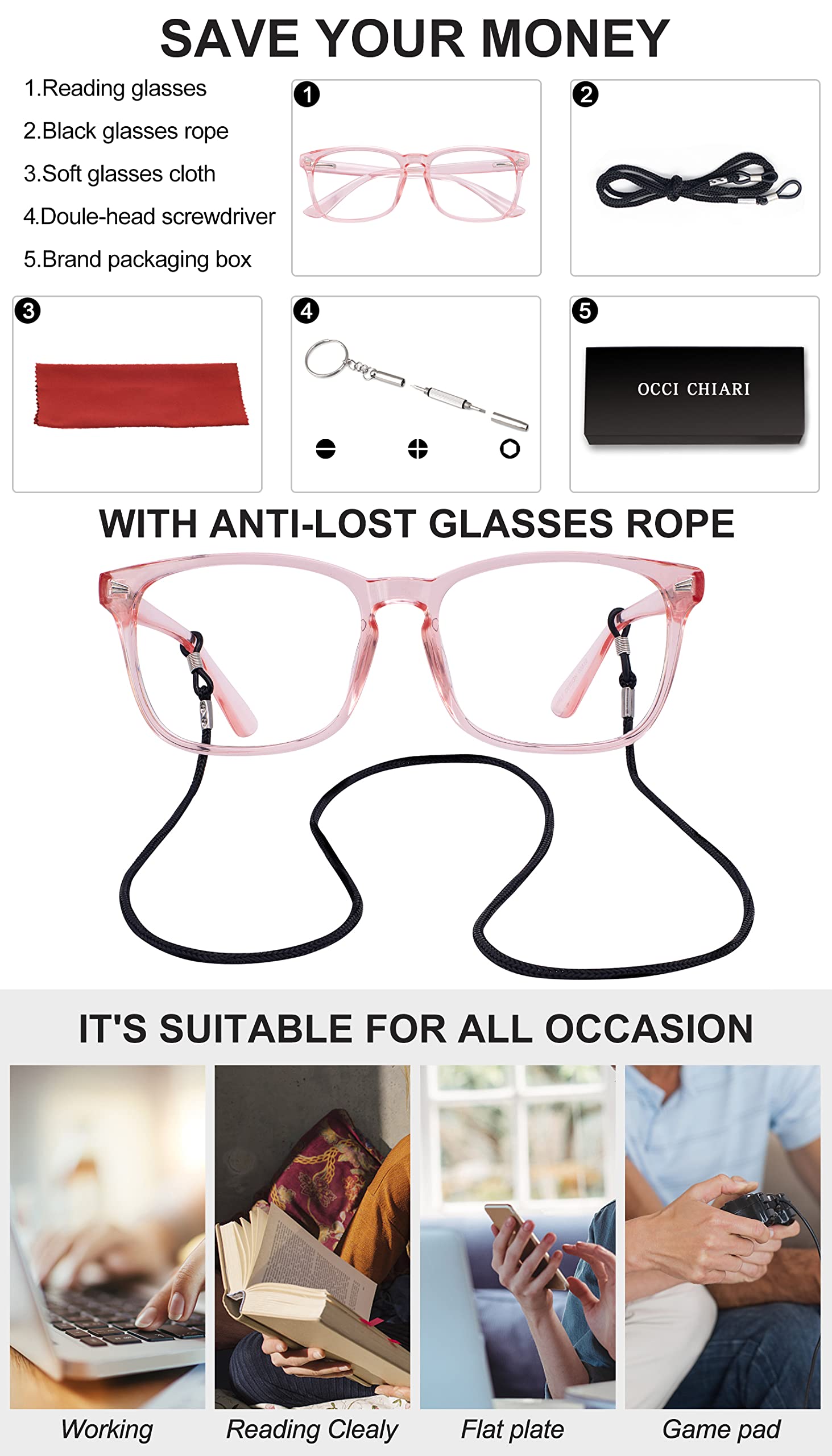 Each pair of our glasses is carefully packaged with our wonderful gifts (glasses cloth, glasses rope, screwdriver)