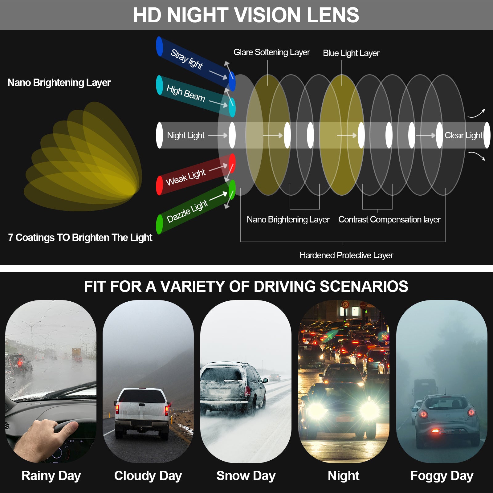 • Night Vision Glasses: These night driving glasses feature an anti-reflective coating that dulls harsh bright lights & headlights, yellow lenses reduce glare from oncoming traffic so you see everything on the road to help keep you and others safe, and a blue light-blocking function. Alleviates visual fatigue and discomfort from long periods of web surfing, gaming and working under fluorescent lights with UV400 protection and glare reduction