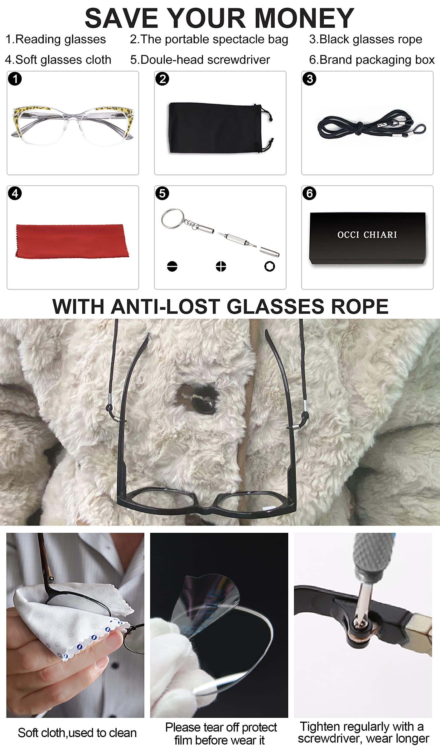 Each pair of our glasses is carefully packaged with our wonderful gifts (glasses cloth, glasses rope, screwdriver)