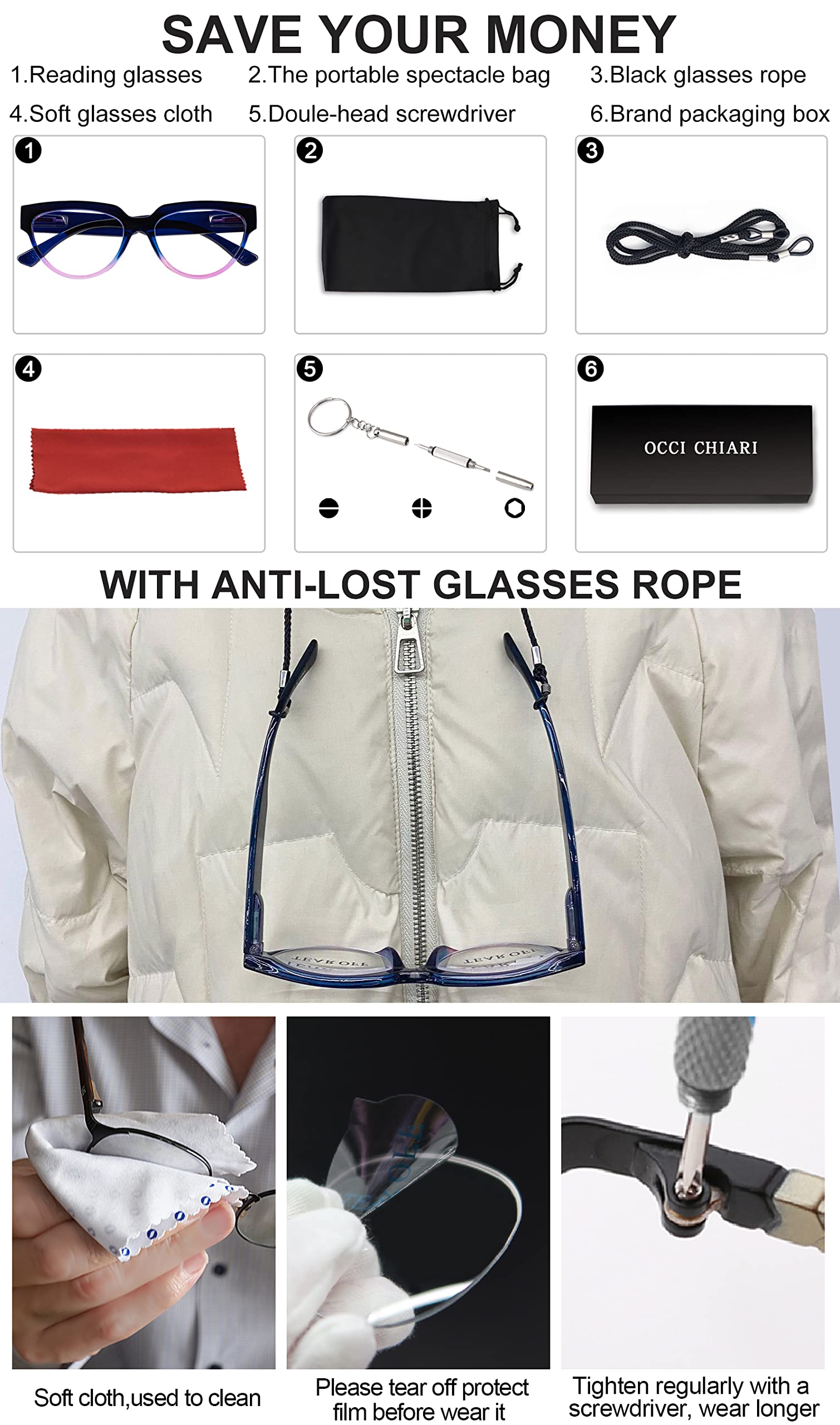 Each pair of our glasses is carefully packaged with our wonderful gifts (glasses cloth, glasses rope, screwdriver)