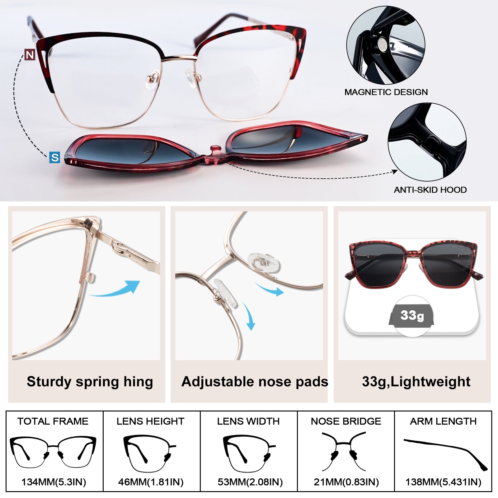 • Magnetic glasses 1.0: Frame width: 5.3''(134mm), Lens height: 2.08''(53mm), Bridge: 0.83''(21mm), Arm length: 5.43''(138mm). The sunglasses readers with metal spring hinge are suitable for women with a middle or petite face; the readers and clips are 33 g; you may feel a little weight if you wear them for a long time.