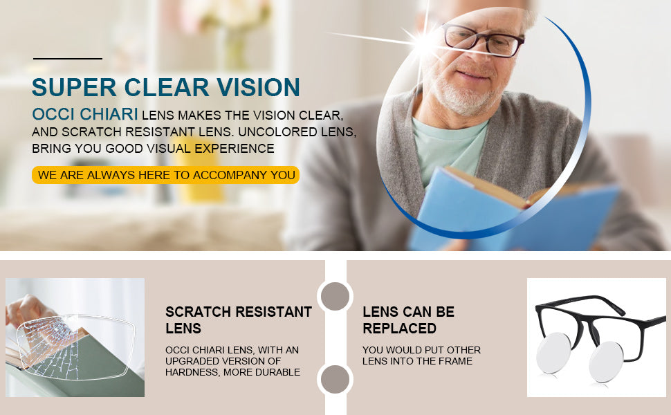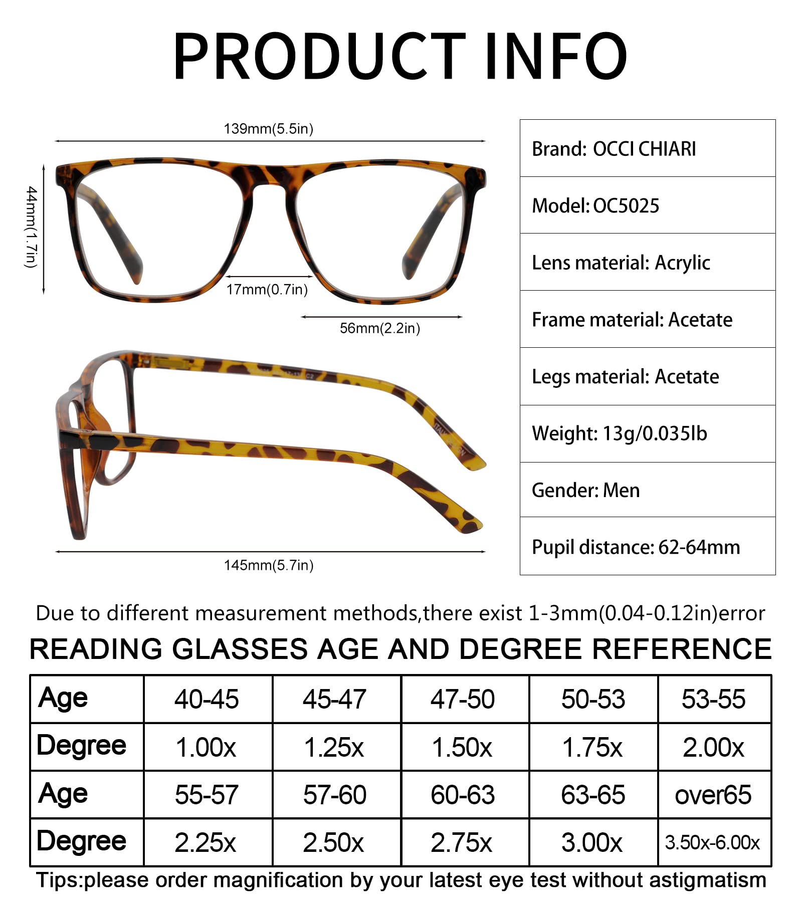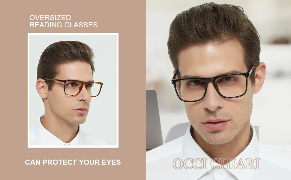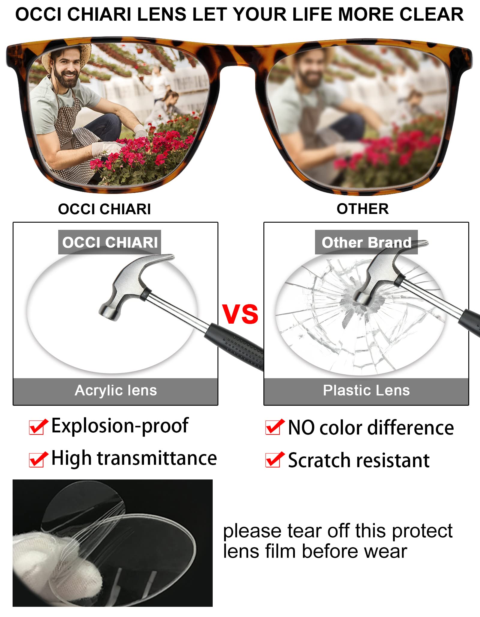 • Crystal Clear LENS :OCCI CHIARI reading glasses has optical,strong,durable frame and clear acrylic ,non-polarized, square lenses.The acrylic lenses are clear enough. This men’s sturdy reading glasses have A-class clear lenses which have higher precision as well ,makes the vision clear,give you a very big and sharp view,weren't so reflective and scratch resistant lens ,this reader glasses have 1.0x, 1.25X 1.5x,1.75X 2.0x,2.25X 2.50x 2.75X .0x 3.5x 4.0x 5.0x 6.0x strength for selection.
