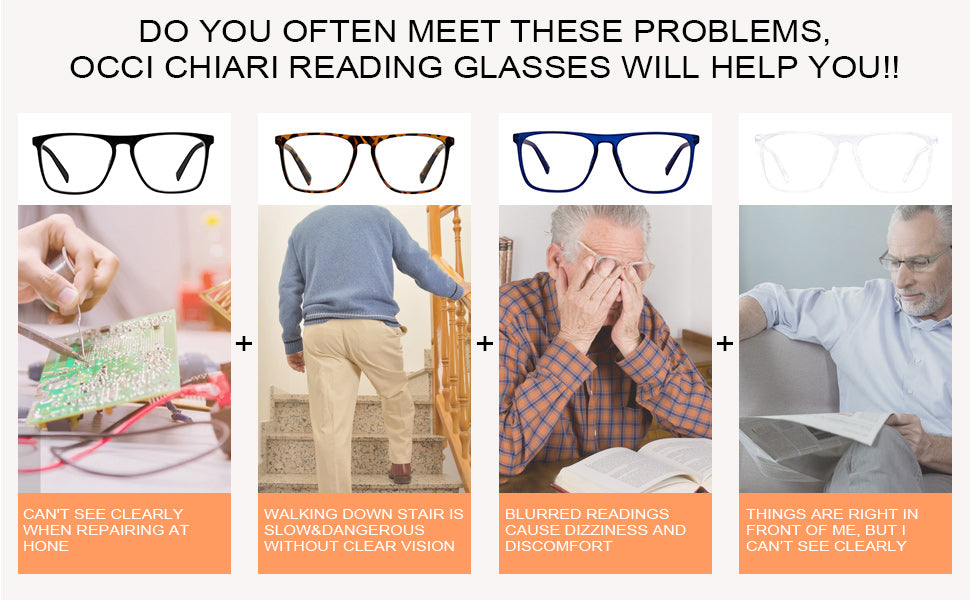 • WEAR FOR LONG TIME:OCCI CHIARI reading glasses using life is more than 3 years after 42356 times of elastic spring hinge hinge.one-piece nose pad,don't easy make red mark,give you good wearing experience.square glasses with lightweight frame,you don't feel tired by wearing all day,The nose pad fit the bridge of the nose,preventing glasses from slipping and imprinting the skin.The nose pad and hinge are designed to make the glasses likely to fall off when you are looking down or exercising