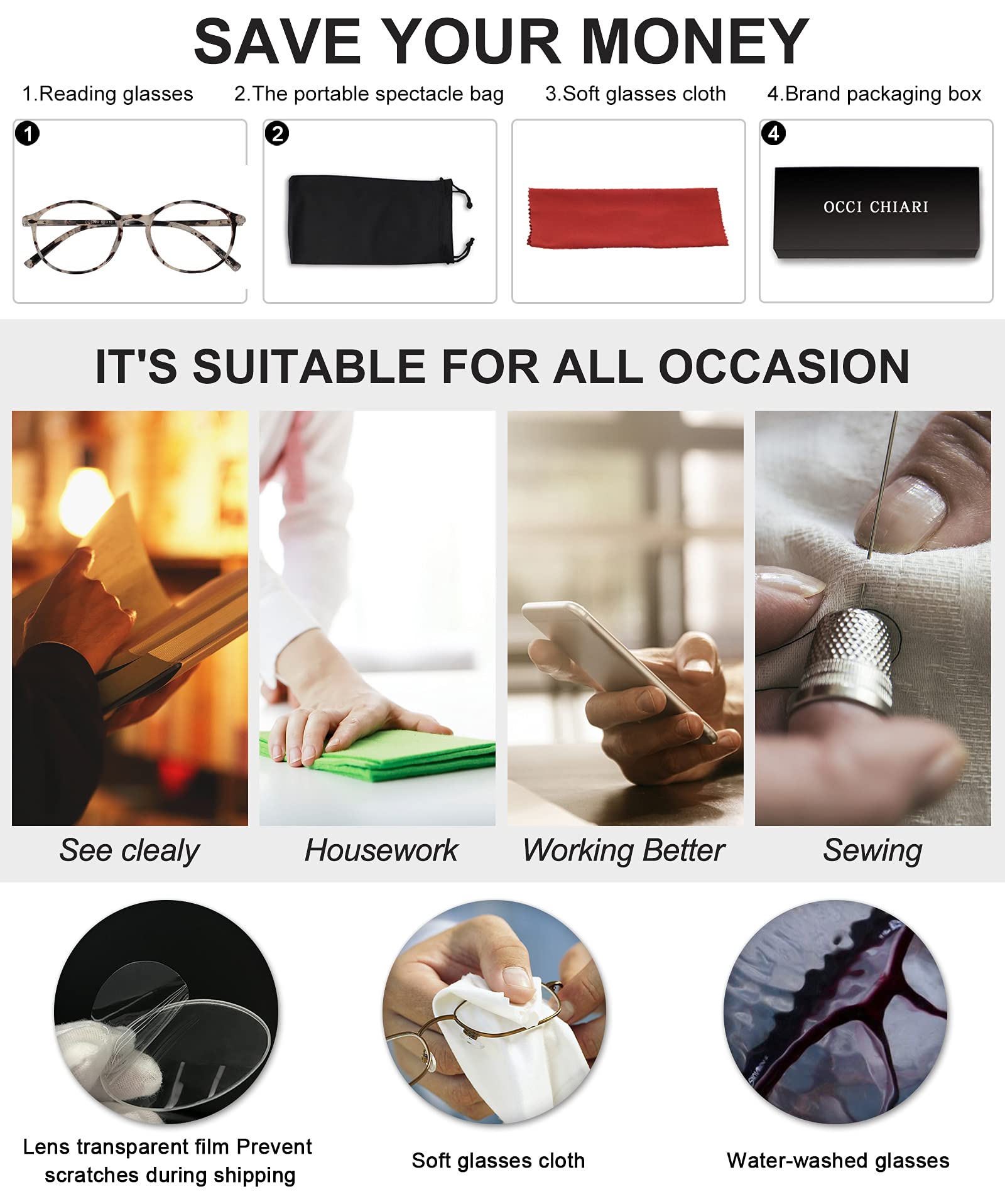 Each pair of our glasses is carefully packaged with our wonderful gifts (glasses cloth, glasses rope, screwdriver)